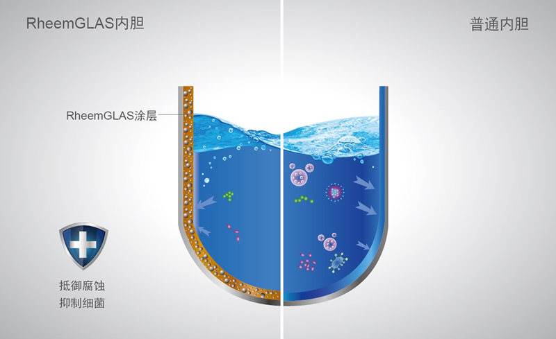 Rheem GLAS內膽,是在含鈦合金鋼板基礎上采用最新工藝,將特殊配方高瓷釉經890℃高溫烘烤使之附著在內膽內外壁上,可以使水與內膽隔離,避免水和鋼板直接接觸,具有不生銹、強度高的優點。所用的瓷釉為非金屬材料,既不生銹,也無水垢,有較強的耐壓能力。